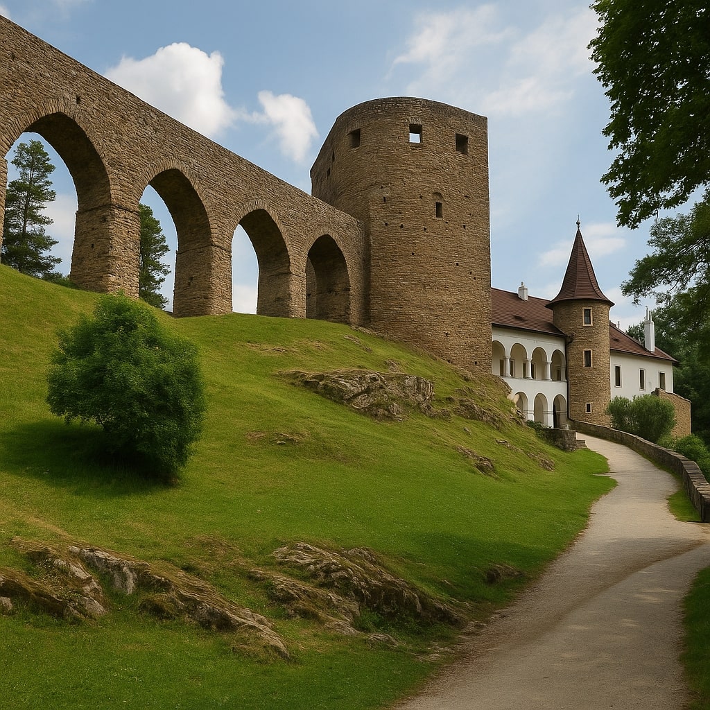 Velhartice is geen kasteel dat domineert. Het ontvouwt zich. Een paleis hier, een toren daar — en daartussen een stenen brug, hoog boven de grond gespannen. Niet decoratief. Niet symbolisch. Functioneel. En toch onvergetelijk.