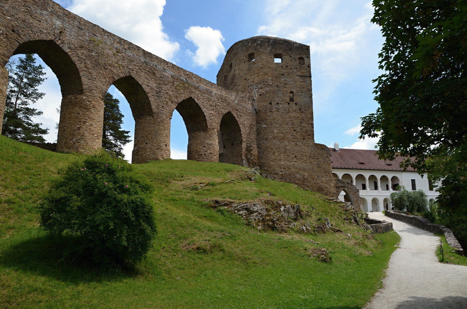 Velhartice is not a castle that dominates. It unfolds. A palace here, a tower there — and between them, a bridge of stone suspended high above the ground. Not decorative. Not symbolic. Functional. Yet unforgettable.